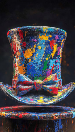 A vibrant, art-streaked top hat paired with a sleek bow tie rests on a multicolored painted surface, evoking playful creativity and whimsical style.