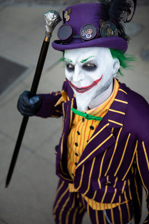 HARROGATE, UK - JUNE 3, 2023. A male cosplayer dressed as The joker from the batman movies with mask