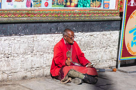 Lhasa, Tibet, China - November 15, 2019: Old Tibetan man with crutches and Tibetan Prayer Wheel sitting on the road side near the Jokhang Temple. Elderly man sitting on the floor and begs for money