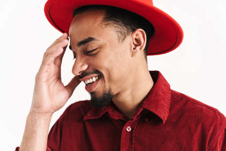 Photo of a handsome african happy cheery young man posing isolated over white wall background wearing hat