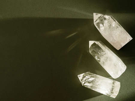 Sunlit crystal quartz points with rainbow refraction on soft fabric.