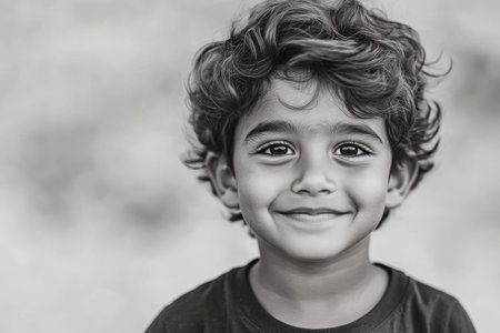 A little boy shows a big smile while standing in a clean background during the daytime. His joyful expression reflects innocence and happiness.
