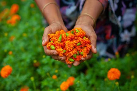 Two handfuls of orange marigold flowers displaying. A woman collecting marigold flowers.