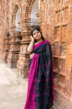 A pretty Indian woman in saree near a terracotta temple of West Bengal