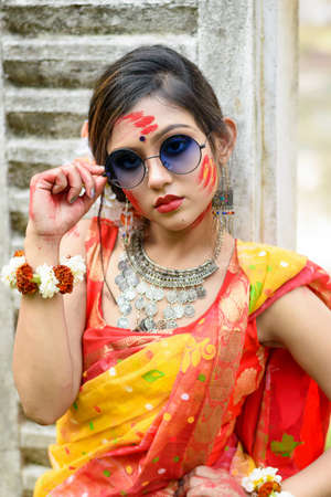 Portrait of pretty young indian girl wearing traditional saree and jewellery, playing with colors and posing fashionable with sunglass on the festival of colours called Holi.