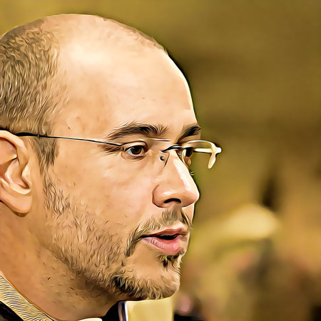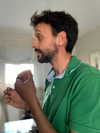 Close up of a Middle eastern man with beard an glasses, white t-Shirt. the man is looking down and smiling
