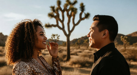 Beautiful diverse couple enjoying romantic connection in stunning California desert setting with golden hour lighting and Joshua trees backdrop