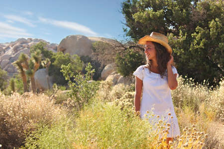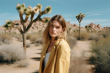 Beautiful young woman in a yellow coat in Joshua Tree National Park