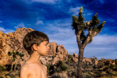 Boy in profile with a Yucca in Joshua Tree, mountains in the back.