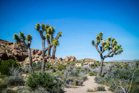 Joshua Tree California landscape in mojave desert with Joshua trees and rocks