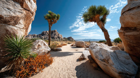 Captivating desert landscape showcasing striking rock formations and distinctive Joshua trees under a radiant blue sky filled with sunlight.