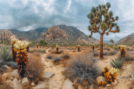 Panoramic photo of the desert in joshua tree, california with tall cacti and a lone tree on an overcast day