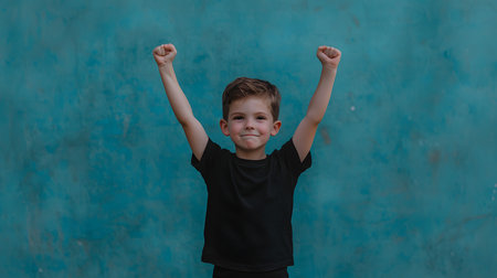 In front of a vibrant turquoise background, a young boy grins confidently with his arms raised in triumph, embodying happiness and achievement, creating an inspiring atmosphere.