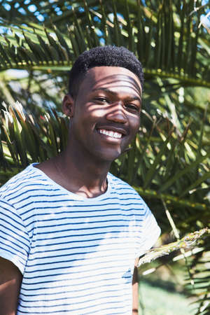 Portrait of a young handsome man with short hair, wearing white t-shirt, outdoors