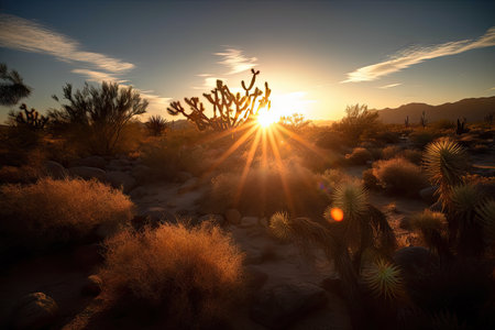 desert sunrise, with the first rays of light peeking over the horizon and illuminating the cacti, created with generative ai