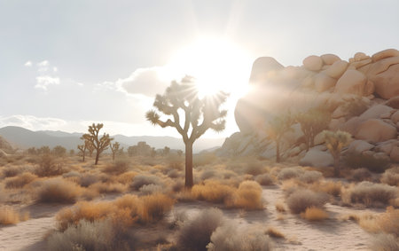 Sunburst Through Joshua Tree in California Desert on quiet day in the park