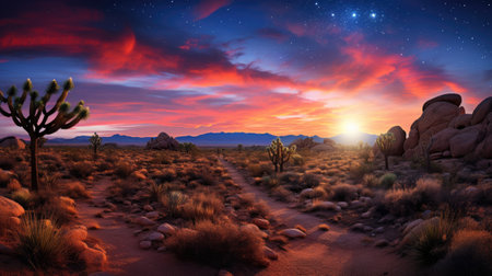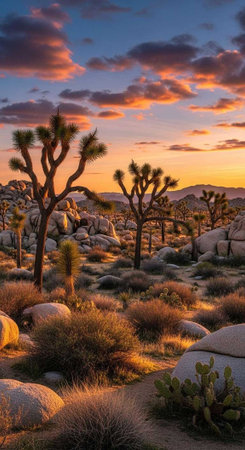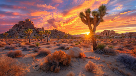 A serene desert landscape at sunset with Joshua trees and large boulders under a vibrant sky