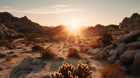 close-up of sunrise on a desert landscape, with sun rays spreading across the sky, created with generative ai