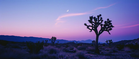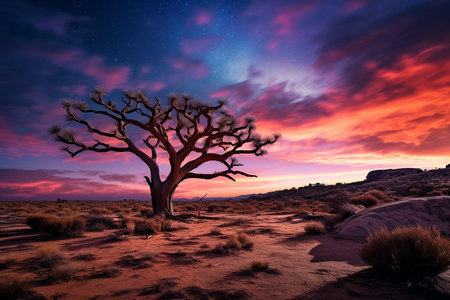 A mesmerizing image suitable for travel brochures, environmental conservation materials, or as an artistic backdrop | This captivating photograph presents a lone tree against a twilight sky, its etched silhouette amidst the brilliant hues of sunset and the emerging night. The stark beauty of the tree, with its network of gnarled branches reaching upwards, stands as a testament to resilience in the harsh desert environment. The shifting colors from dusky purple to fiery orange create a symphony of light that seems to celebrate the day's end while welcoming the night. Stars beginning to twinkle in the darkening sky add a touch of magic to the scene, symbolizing the vastness of the universe and the enduring nature of life under the cosmos. The textured sand and hardy desert vegetation in the foreground are bathed in a warm, subtle glow, highlighting the diverse textures of this arid landscape. The image perfectly captures the contrast between the ephemeral beauty of twilight and the eternal ruggedness of the desert | Ideal for conveying themes of natural beauty, solitude, and the passage of time in editorial content, or for evoking a sense of wonder and exploration in travel-oriented materials. Art collectors and enthusiasts might appreciate this image for its artistic value and the emotions it evokes. It can also serve as a striking visual element in environmental campaigns highlighting the importance of preserving natural landscapes | a stunning photo of a desert scene at twilight with a solitary tree against a backdrop of vibrant sky and emerging stars, providing ample visual interest and space for text or design elements