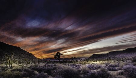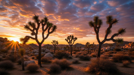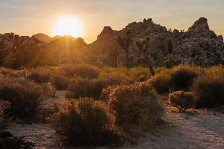 Colorful sunset light shining over panoramic desert landscape scene in Joshua Tree National Park, California