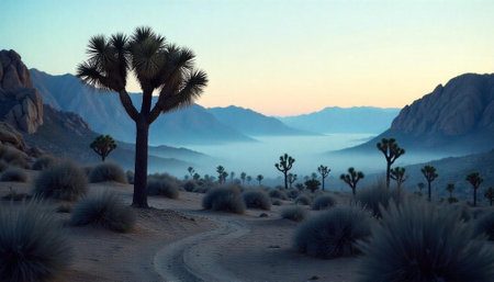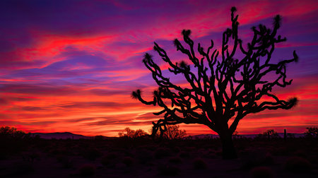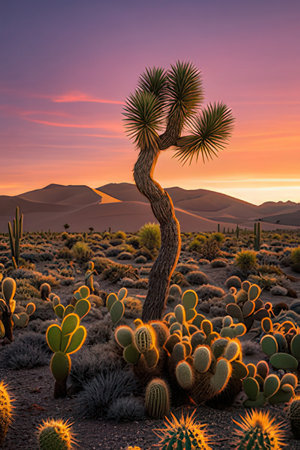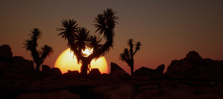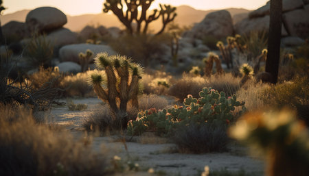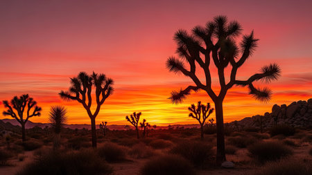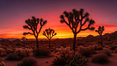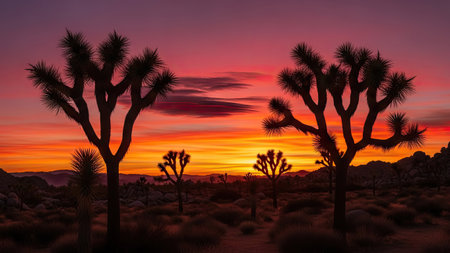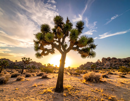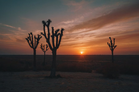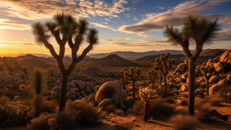 a stunning photograph capturing the beauty of joshua trees at sunset in el californio. this landscape showcases the intricate details of the trees, with saturated color fields reminiscent of detailed illustrations. the realistic perspective and traditional british landscapes influence are evident, reminiscent of artists like shepard fairey and becky cloonan. the nature-inspired composition adds to the overall allure of this captivating image. ai generated