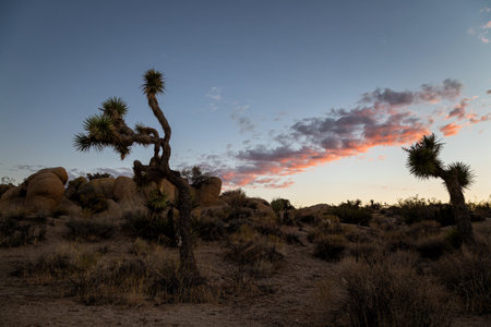 2 trees in a Sunset over Joshua Tree National Park, California, USA
