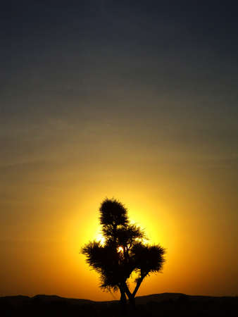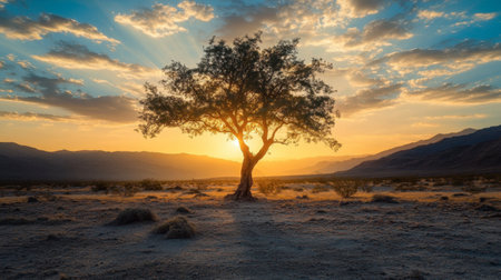 A tree in a desert landscape, standing alone with the sun setting behind it.