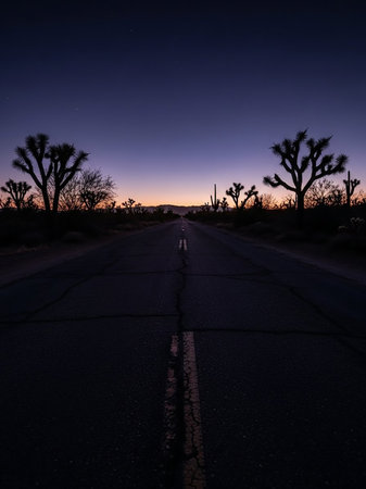 A cracked asphalt highway stretches into the distance under a deep purple and orange twilight sky. Silhouetted Joshua trees and desert vegetation line the sides of the road, creating a stark and...