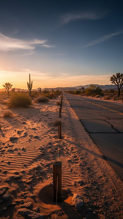 A desert highway stretches towards the horizon at sunset, bordered by sand dunes, Joshua trees, and a weathered wooden fence under a colorful sky.