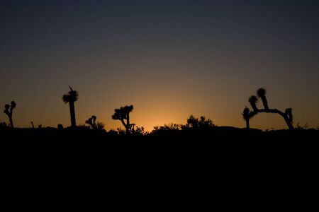 Trees in silhouette during orange sunset, at Joshua Tree National Park, California, USA.