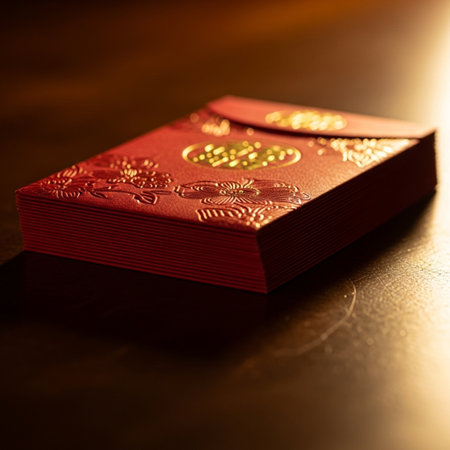 Chinese New Year Stack of Red Envelopes Glittering with Golden Patterns Concept of Tradition, Prosperity, Gift-Giving, and Cultural Celebration. Vertical. Copy space.