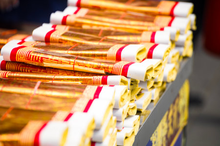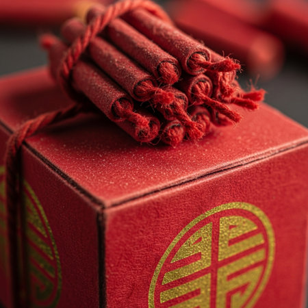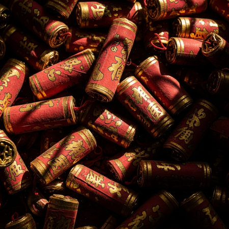 Unlit, decorative Chinese firecrackers wrapped in distressed red and gold paper, photographed with h