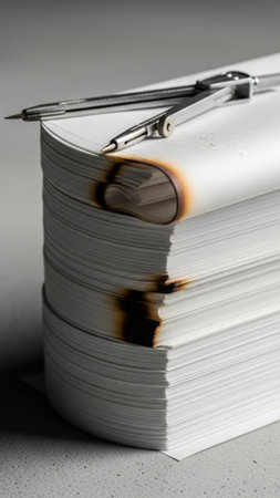 A vertical composition focusing on the aftermath of intense design work. A highly detailed, matte me