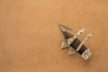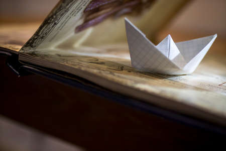 Origami paper sailboat mockup. Selective focus. Old vintage craft background