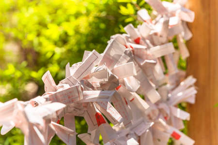 Close up on Shinto o-mikuji fortune strip papers folded on a wooden omikujikake in a shrine of Tokyo.