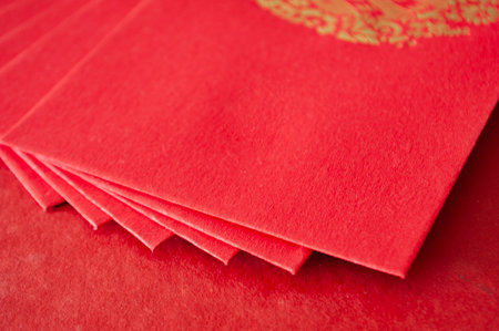 Chinese New Year red envelope on a dark background. Shallow depth of field