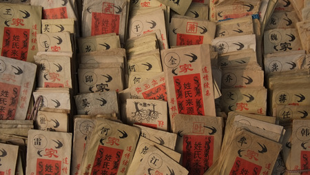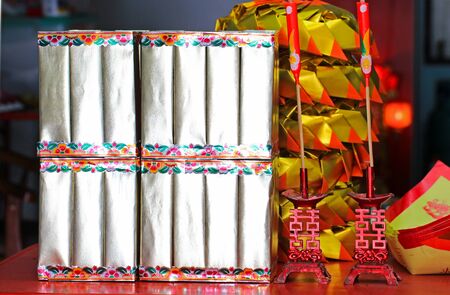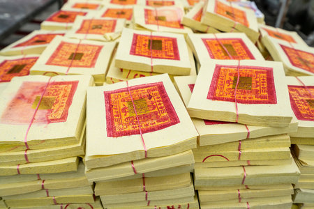 Yunlin, Taiwan - July 13th, 2019: chinese joss gold paper craft on a table at Beigang Chaotian Temple, Yunlin, Taiwan, Asia