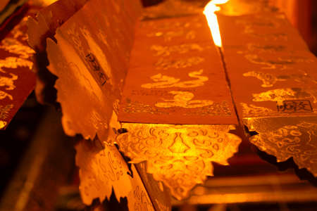 Chinese paper art use for worship.And a shrine in the background.Focus on the top paper.