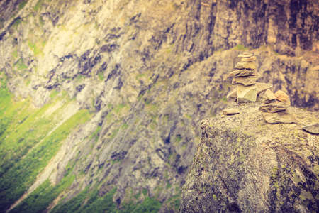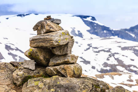 Tourism vacation and travel. Stone stack in foreground and snowcapped mountain tops hills, view from Dalsnibba viewpoint, Norway Scandinavia.