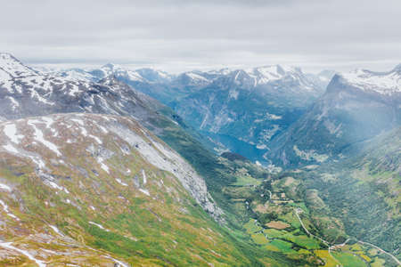 Panoramic mountains landscape with Geirangerfjord from Dalsnibba area. Geiranger Skywalk viewing platform on mountain in distance. Norway.