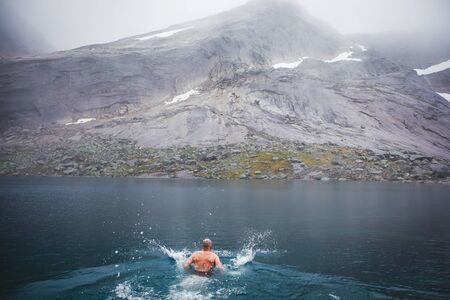 Healthy young man happy traveler tourist standing on top of a rock high in the mountains, enjoying the natural beauty in the morning light. Scandinavia and Arctic background with snow and glacier. Concept of active healthy lifestyle adventure journey vacations.