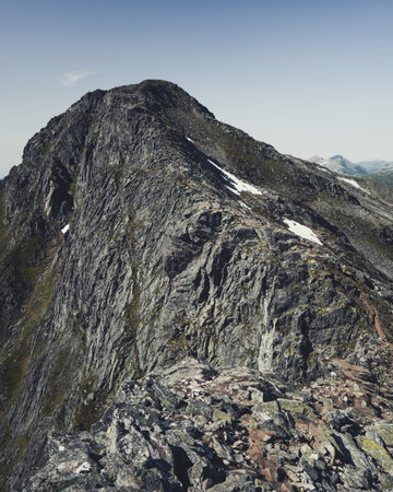 Norwegian mountain landscape during hiking to Halls Fortopp peak, with a view on Stetind, Northern Norway, Nordland county, municipality of Tysfjord, Ofoten, with fjord and lake