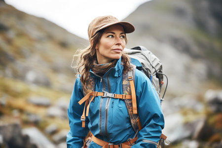 Confident female hiker in blue jacket and backpack, holding a walking stick, on a mountain peak, with a stunning mountainous landscape and blue sky in the background.