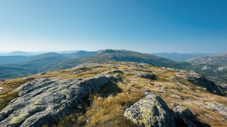 Top view of a mountain plateau with clear blue sky, ideal for adding copy