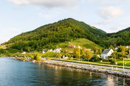 Norwegian village landscape, mountains and colorful traditional houses in Olden, Norway