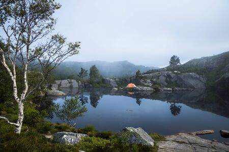 Tourist tent on the shore of a lake in the mountains. Beautiful Nature Norway natural landscape.