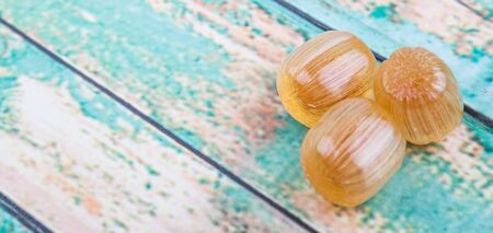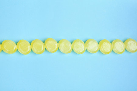 Yellow marmalade (jujube, candied fruit jelly) on blue paper background. Food background.