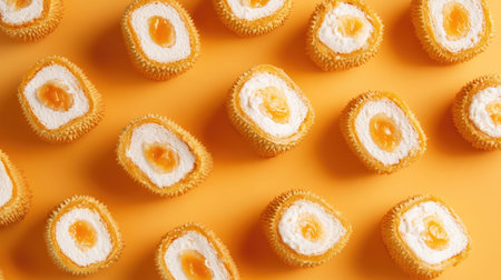 A visually striking array of sweet coconut treats featuring juicy fruit centers, beautifully arranged on an orange background, ideal for dessert lovers.