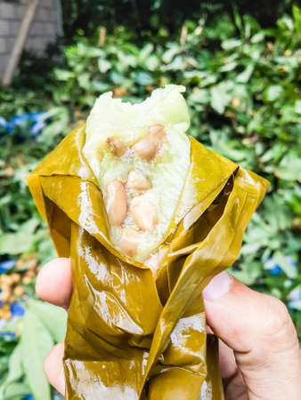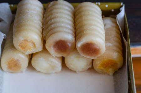 Egg swan dessert of Thailand or Fried glutinous rice flour stuffed with palm sugar and grated coconut topping in wooden dish on concrete table.