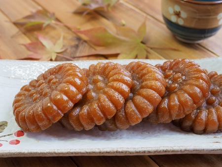 Yakgwa, Korean style honey cookie : Flour mixed with honey and sesame oil, pressed in a yakgwa pan (yakgwa mold), shallow-fried or deep-fried, dipped in grain syrup or honey